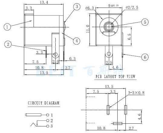 DC電源插座DC-005額定值是DC30V0.5A,插入力度是3到20N,是插件DC電源插座,針芯直徑2.0/2.5,DC插座的孔徑尺寸是6.4mm.3個插腳。壽命5000次,具體參考DC-005的圖紙說明。